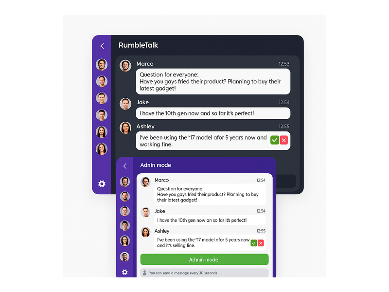 RumbleTalk’s Members Chat is the ideal foundation for an internal team chat widget. It connects directly to your user authentication system, so only registered and verified team members can access the chat. Participants are identified by their real names and roles — no anonymous handles, no unauthorized access. Admins can assign different permission levels, create private rooms for specific teams, and manage the entire chat environment from a single dashboard without touching any code.