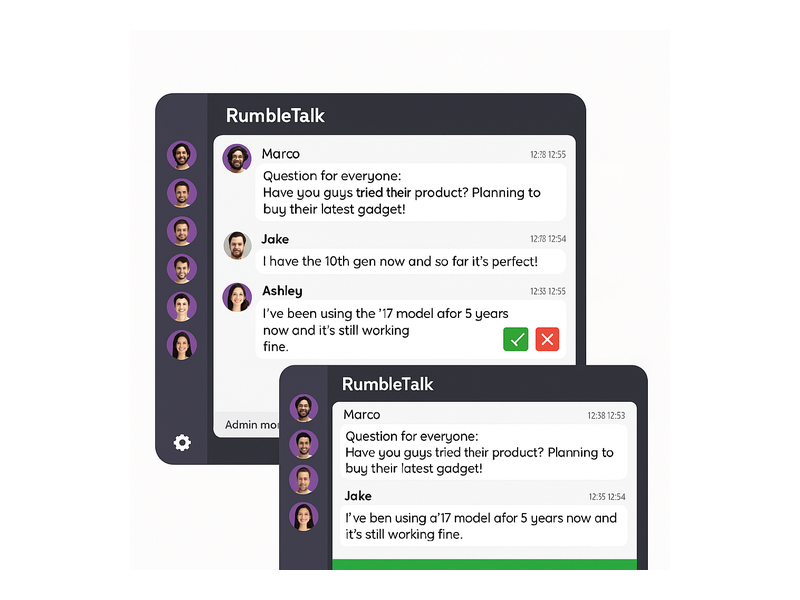 Gaming tournaments, esports championships, game reveal events, and weekly gaming streams each have a distinct rhythm and energy. RumbleTalk’s chat modes map directly to these scenarios. During a fast-paced match, open Group Chat lets the audience flood the room with reactions, predictions, and commentary — mirroring the social experience of watching with friends. During a developer AMA or a post-match analyst breakdown, Moderated Q&A lets your team approve questions before they go live, keeping the conversation focused and productive.