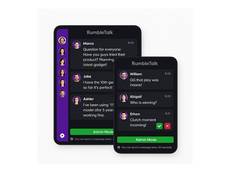 Moderation is the most critical operational challenge in any live gaming stream chat room. Spam, toxic behavior, and off-topic flooding can derail the experience for your entire audience in seconds. RumbleTalk gives admins a complete toolkit: