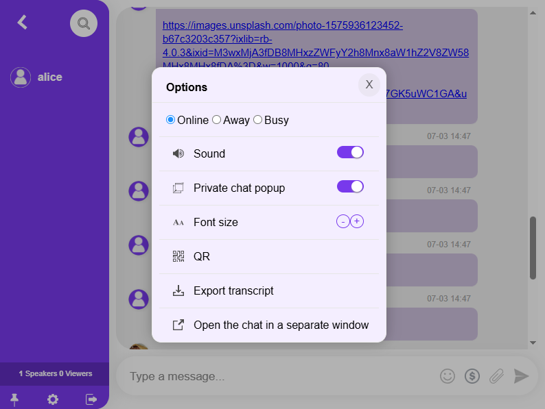 Users can turn the sound on/off for notifications and disable the sound notification when someone leaves the chat or types a message. If you need to add the ability for all users to get a notification when someone enters the chat room, this is done in the chat owner admin panel.